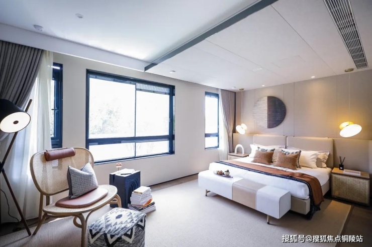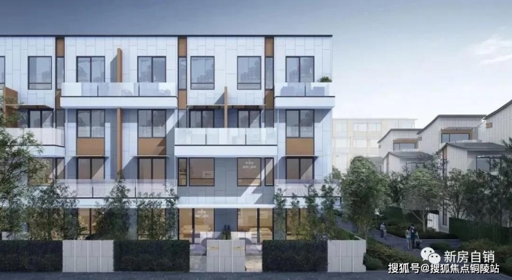 东滩云墅采用现代中式简约建筑风格,主要立面材料选择米白色真石漆,局部铝板及铝合金线条点缀建筑立面,立面简洁统一,强调横向线条,大气典雅。