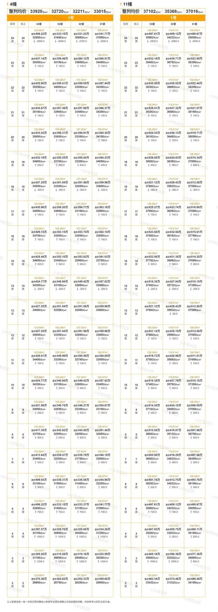 上一轮项目推出四开房源,分别是4、11号楼,建面约103方、109方、120方、137方、138方户型都有,均价3.4672万/平,还剩少量房源线下可捡漏。