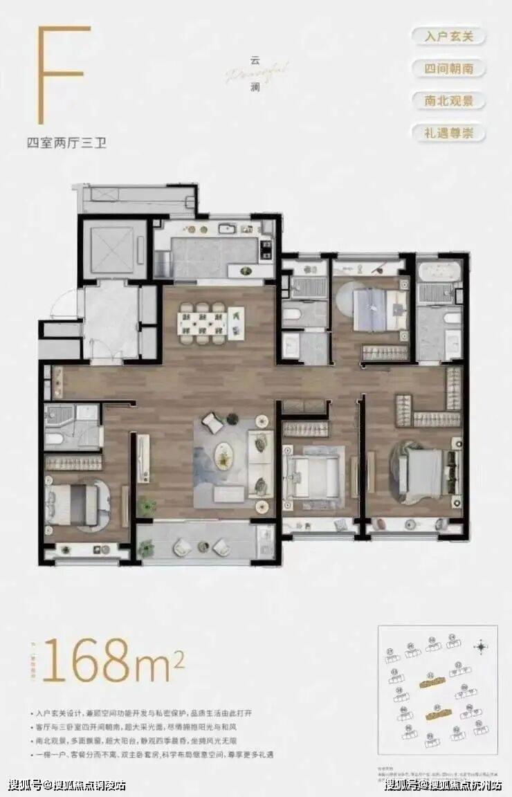 另外,四房户型双房朝北似乎是逃不开的问题,但陆家嘴锦绣云澜这个建面约168㎡的4房却做到了三间卧室全朝南,并且南向双套房设计。