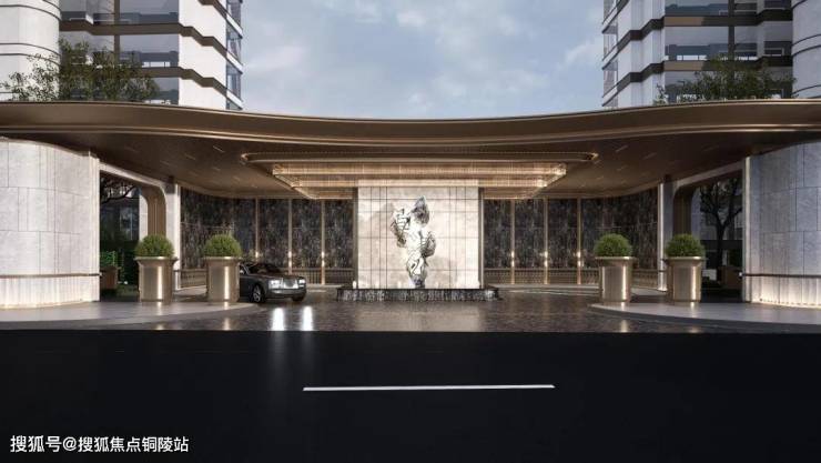 挑高金属雨棚采用极细边,中间凿壁采用透光奢石,搭配极具现代主义的雕塑彰显小区档次,背景墙面采用维多利亚黑大理石,奢华且低调。