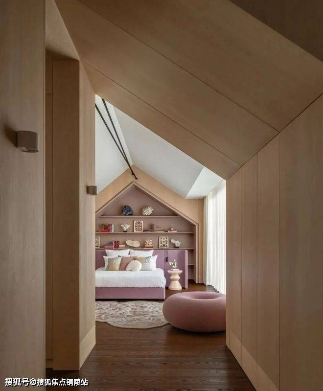 四层阁楼是大女儿的卧室。这里的斜顶启发我们在空间内打造了一个木质小屋;配备私人浴室和衣帽间,还有一个露天阳台,仿佛这充满阳光的一层就是个独立公寓。