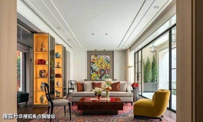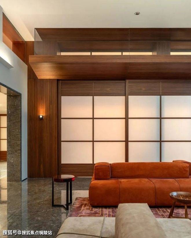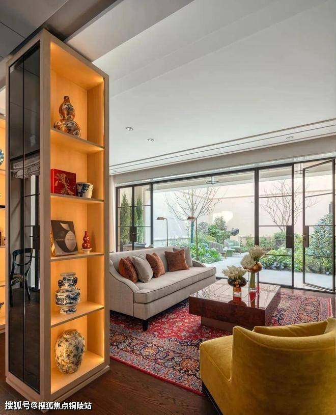 在客厅中,两个展示架巧妙地将空间分隔成主客厅区和休闲室,营造出一个与建筑尺度交相辉映的层次空间。