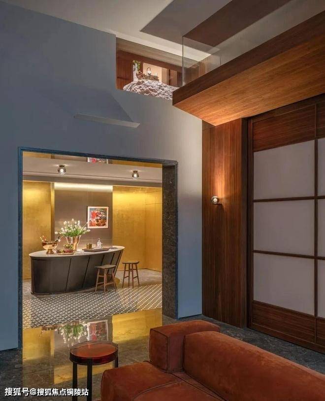 在“木屋”后方,是一个墙面和天花板都覆盖金箔的“水吧”。在这里,我们重新引入了一些当代西方设计语言——大理石地面图案、蛋形吧台和墙面护板细节。这些元素与醒目的红色高光烤漆柜相互平衡。