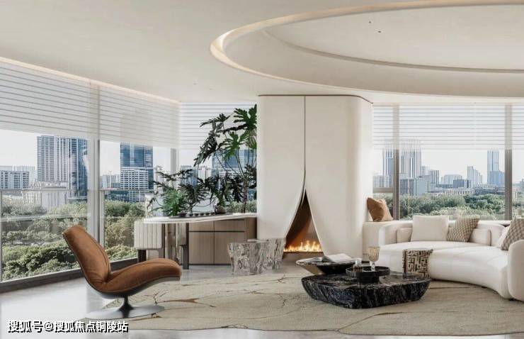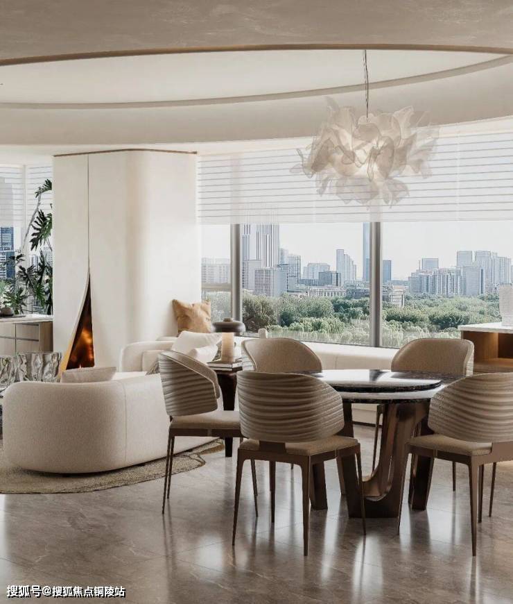 客厅以环幕弧形落地窗为主角,我们把沙发做成包裹感的柔润弧形围合,让居家的松弛栖居自然发生。奶油白的圆润体块感沙发,搭配一把焦糖弧形单椅作为 “视觉锚点”,轻轻拉开层次。