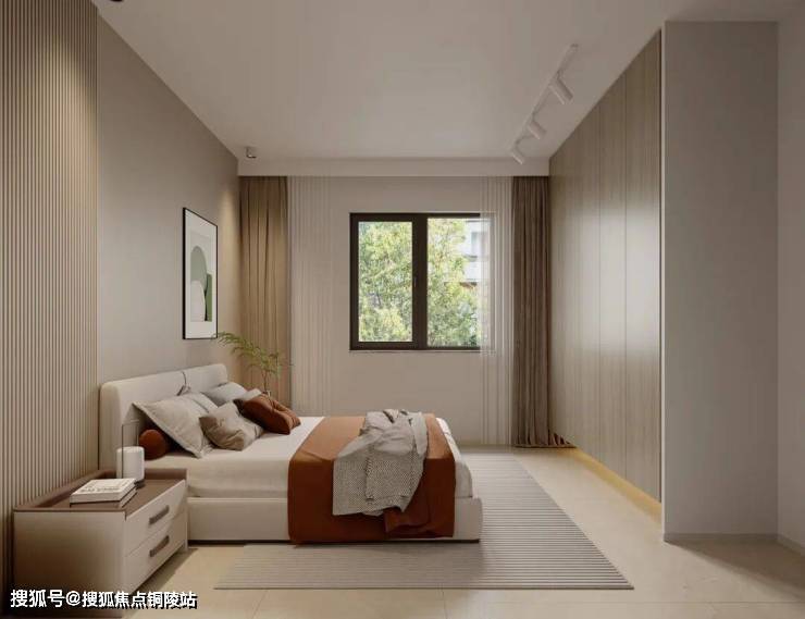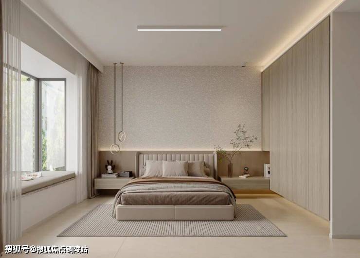 卧室延续温润极简基调,以低饱和暖调营造松弛氛围。床头肌理墙搭配线性灯,整面木色衣柜兼顾收纳与整洁,飘窗休闲角搭配纱帘滤入柔光,打造治愈休憩角落。