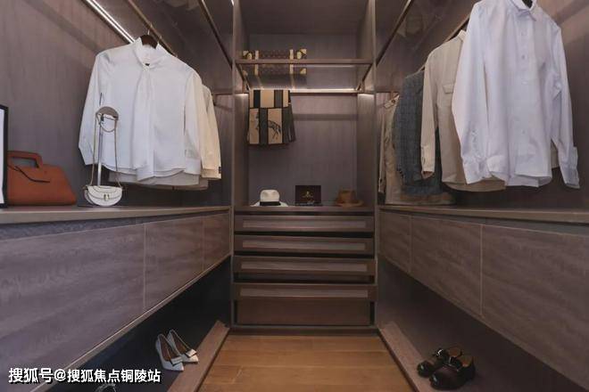衣帽间墙面设计内嵌式圆角分层镂空壁龛,用于陈列物件,圆弧造型弱化柜体厚重感。衣帽间内整合同材质一体化嵌入式悬浮化妆台,集成台面、抽屉收纳、化妆镜等多功能模块,梳妆功能内嵌于空间,实现一室多用,不额外占卧室空间。