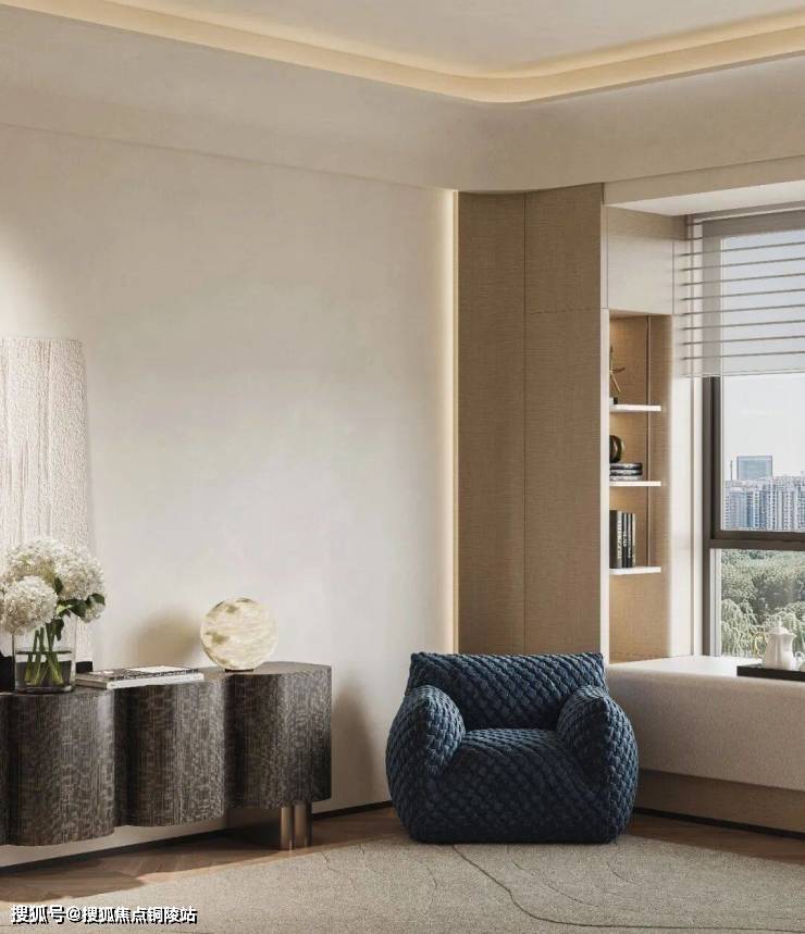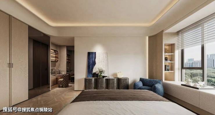 收纳上采用整面隐形通顶衣柜搭配内嵌开放壁龛,极简整洁且储物充足;软装精简克制,圆润家具与艺术陈设错落排布,兼顾睡眠、休闲等多重功能,同时衔接户外窗景视野,在私密空间里,打造出兼具高级质感与治愈温度的休憩居所。