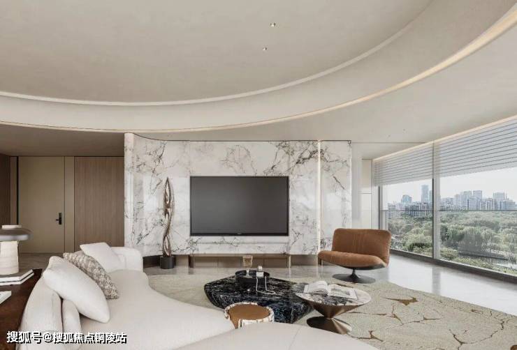 电视背景区域以曲面柔化设计,墙体做圆弧转角,弱化方正空间棱角,与全屋环形吊顶曲线呼应。