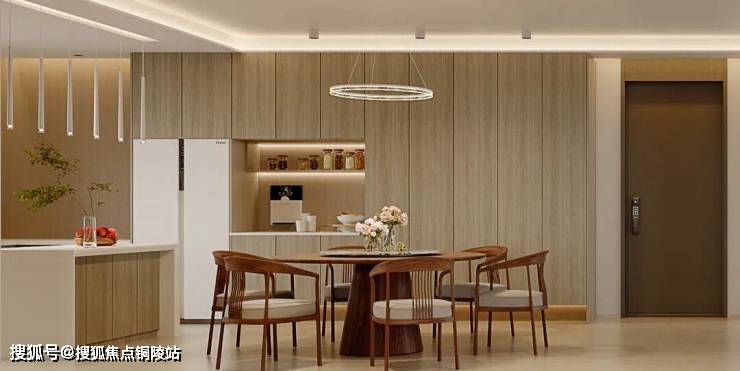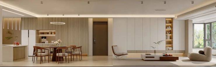 餐厅与客厅无缝衔接,延续整体极简调性,却藏着专属的烟火仪式感。设计以“适配家庭用餐、兼顾亲友相聚”为核心,将实用性与美学感完美融合,让每一顿三餐都成为生活的小确幸。厨房采用U型+岛台布局,贴合日常烹饪动线,整体搭配木色柜门,与空间整体极简调性呼应,兼顾实用与颜值,让烹饪时光更具舒适感。