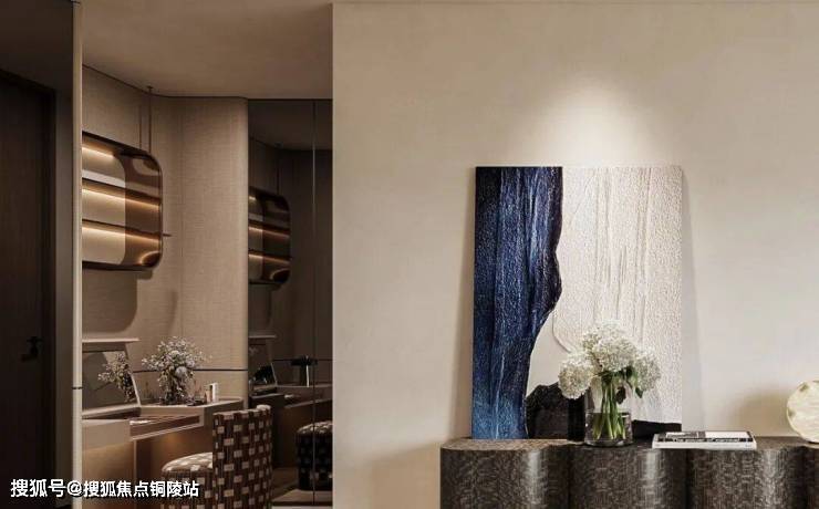 选材上,整面大花白奢石通铺背景,以天然石纹奠定空间高级感,底部配金属收口。灯光用多层间接光源,即吊顶弧形灯带与墙面隐形洗墙光,以柔和光影凸显石材肌理,营造温润静谧氛围。