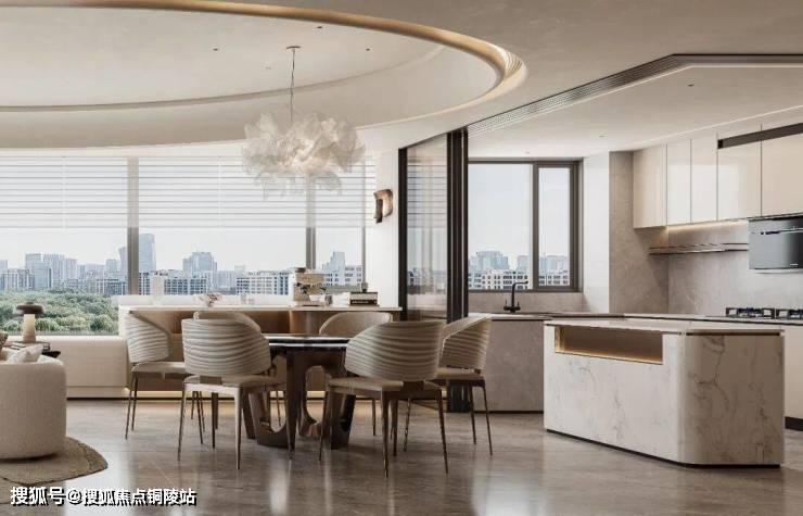 延续客厅的圆弧设计语言,顶面环形吊顶自然延伸,贯通客餐两区;开放式格局摒弃硬性隔断,使空间动线流畅舒展,彻底释放大平层的开阔尺度,实现起居与用餐空间在视觉上的和共生。