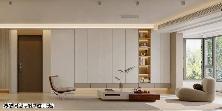 以极简留白为底,沙发背景采用木色墙板,温润有质感;投影背景为白色柜门,穿插木色悬浮抽屉柜,虚实结合、层次分明。米白色哑光地砖通缝铺贴,质感柔和,浅色沙发搭配浅棕单人椅,全景窗引入充足自然光,无主灯设计营造治愈氛围,简约中尽显质感。