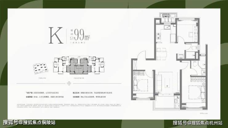 实现了大面宽横厅的飞机户型设计,使得南向的开间,全部布置为客厅、主卧和次卧三个最重要的功能区;北向房间则布置了次要的厨房、次卫、书房和主卫功能,最优化的提供南向面宽和缩窄户型整体进深,提升户型整体的采光和通风。