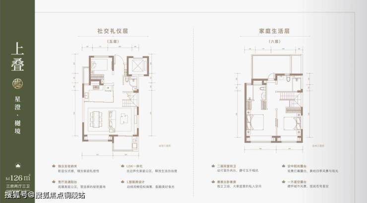 户型解析:建面约126㎡上叠产品,带有空中花园露台,日常聚餐、烧烤、开party等娱乐活动有大展拳脚的空间,同时客餐厅一体化+U型厨房空间+尊崇主卧套房,户型设计合理,格局方正。