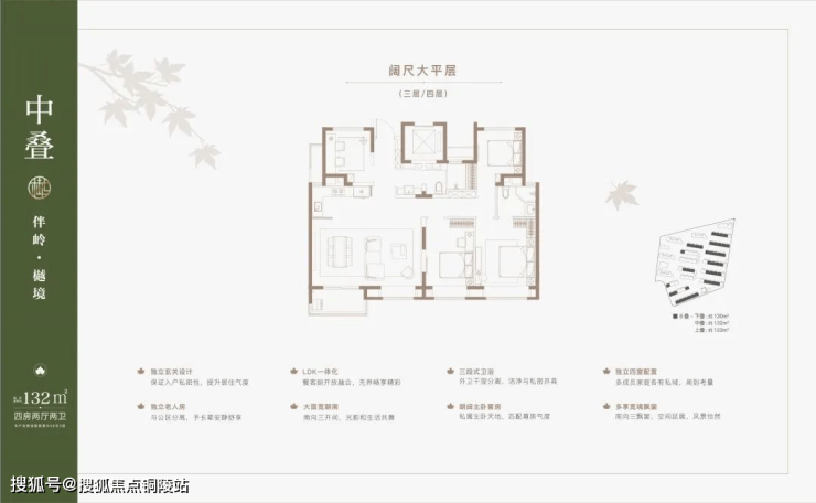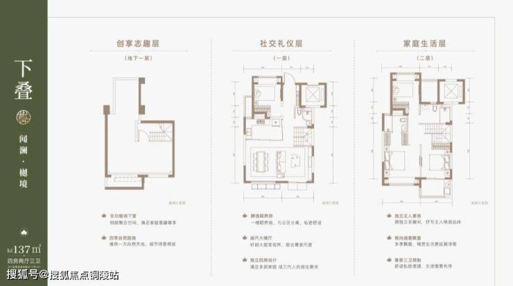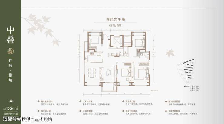 户型解析:建面约137㎡下叠,四房两厅三卫全能格局,非常适合二娃家庭以及三代同堂。