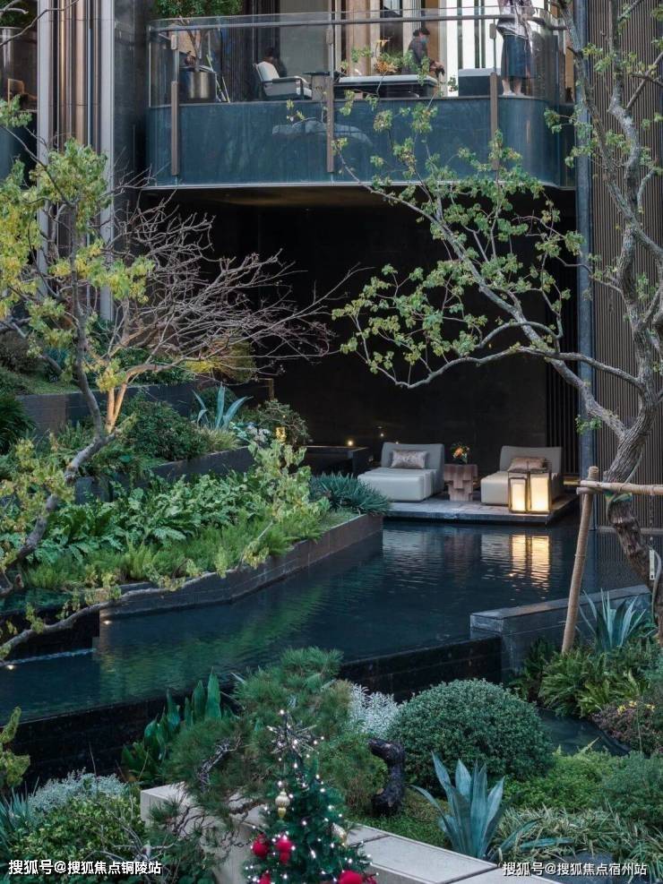 自【悬浮茶室】拾级而上,在【思韵书院】外,一处闲憩放空的【阅川水岸】至此呈现,脚下溪流自脚下蜿蜒而过;眼前,是幻影蓝奢石池底的幽邃微光。一株来自地中海的油橄榄,与一棵百年老桩紫薇在此相望。