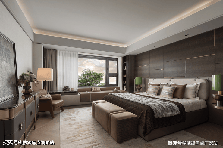 次卧延续开篇仪式感,以特殊工艺手法打造的床背极具特色,床头柜与飘窗一体链接,与整体流线相结合,勾勒出丰润舒畅的状态。突出的材质纹理,以涓涓细流述说着生活的诗意。