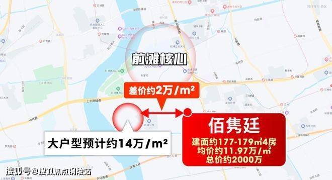 先看与前滩核心二手房的差距。前滩二手市场看似均价15-16 万/㎡,但这基本是小户型的水平;真正稀缺的大户型,成长性早已拉开差距,普遍站到18万+/㎡。像晶耀名邸150+㎡4房,挂牌价超19万/㎡,总价直逼3000万;九宫格的三湘项目,挂牌价更是达19-25万/㎡的高位。