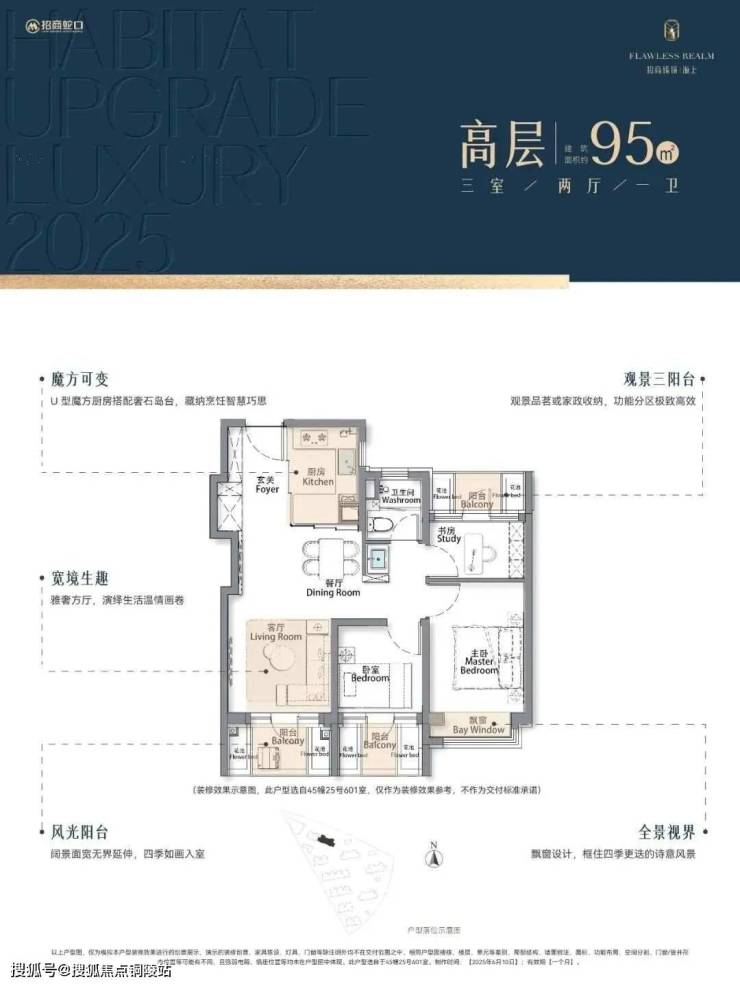 再加上南向大面宽短进深、全卧飘窗、L型转角阳台设计,哪怕小户型95㎡3房,尺度感都超棒,采光和视野更是一流。