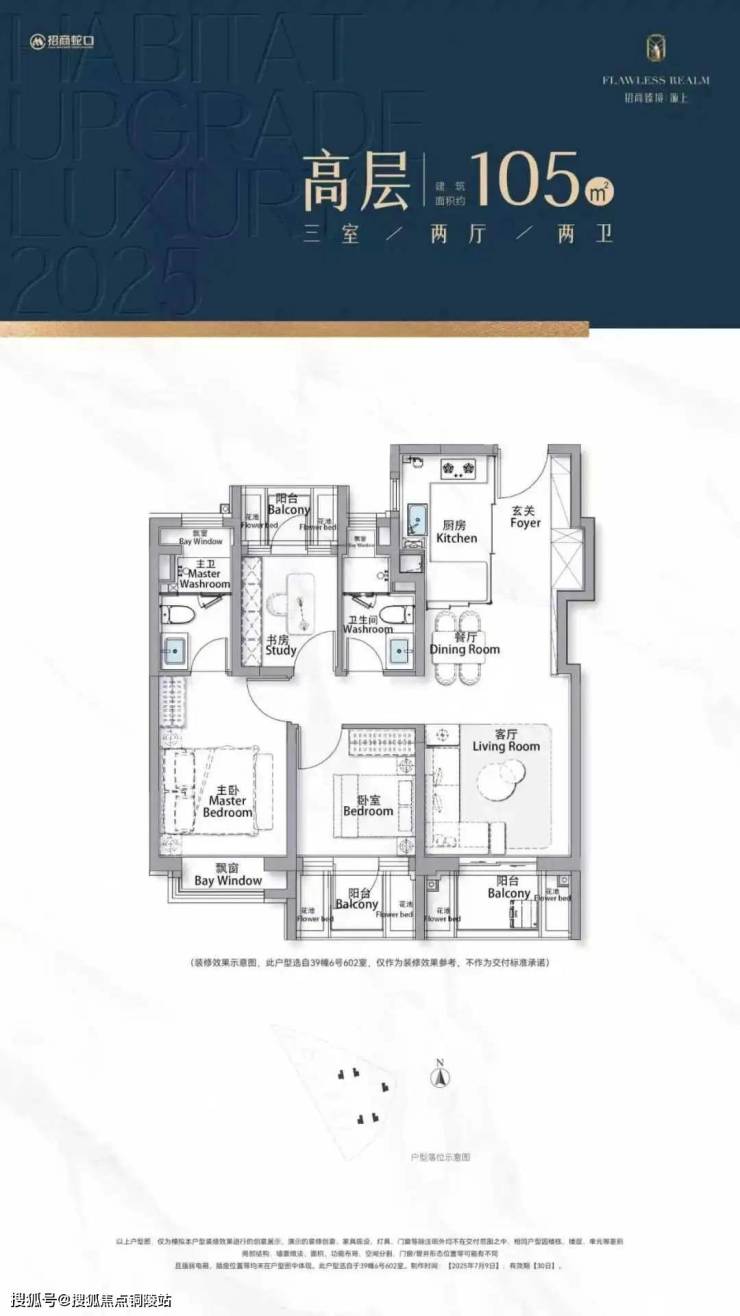 建筑面积约105㎡三房,进阶改善绝版“三阳台”户型,主力总价段约700万级,部分房源总价约650万级。