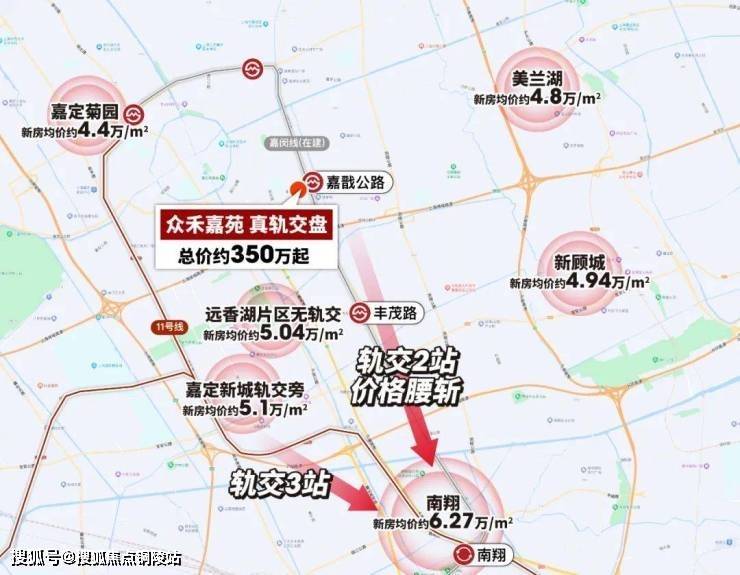 另外,距众禾嘉苑仅一站的丰茂路站,即为一主二辅枢纽体系中的嘉定东枢纽,是嘉闵线、宝嘉线的换乘站,2站内三轨交环绕的交通格局让这个项目拥有非常强大的人口导入能力、交通出行便捷度。