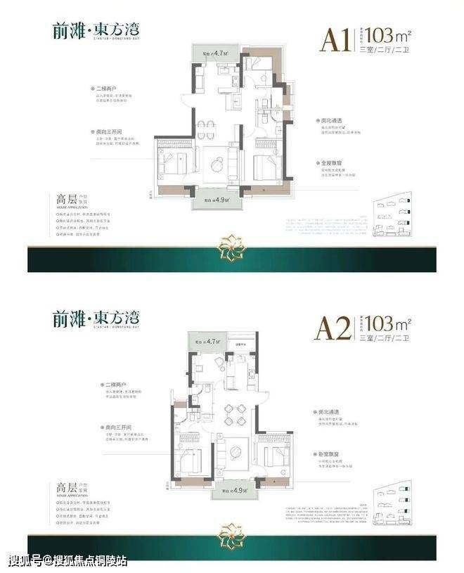 户型建筑层高3.1-3.15米,无连廊,双阳台配置。其中建面约103平户型2梯2户,其余一梯一户。