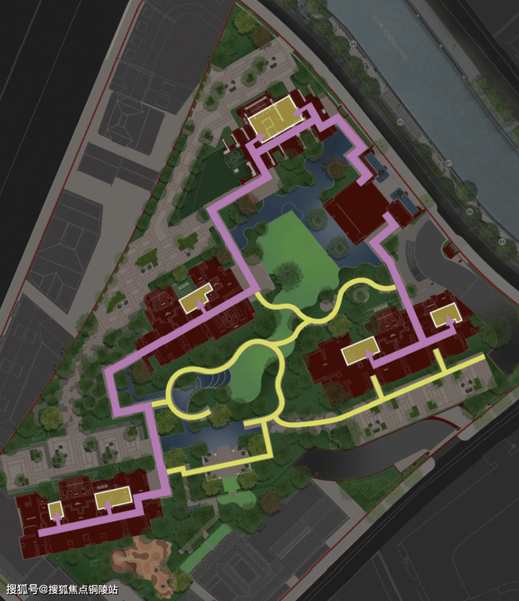 社区约3000㎡的中心花园和6大艺术花园,不仅让每栋楼都享受“楼王”的待遇,且自然勾勒出一条漫游式的公园归家动线(黄色线条走向)