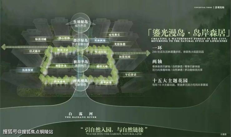 以“山水聚场”理念,规划“一环两轴十五园”景观布局,将水岸、岛屿、森林、花园、树屋作为园林节点,形成“行在景中、坐在岛中、游在林中、意在境中”的美学表达,营造出沉浸式山水活力场域。