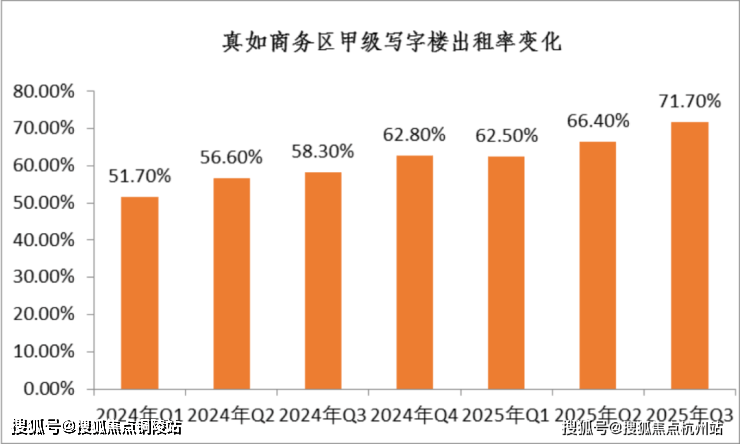 真如的产业规模十分扎实。公开数据显示, 2024 年,中海中心跃居上海写字楼年度租赁市场成交榜首。真如商务区甲级写字楼出租率也一路攀升——从2024年一季度的51.7%,提升至2025年三季度的71.7%。