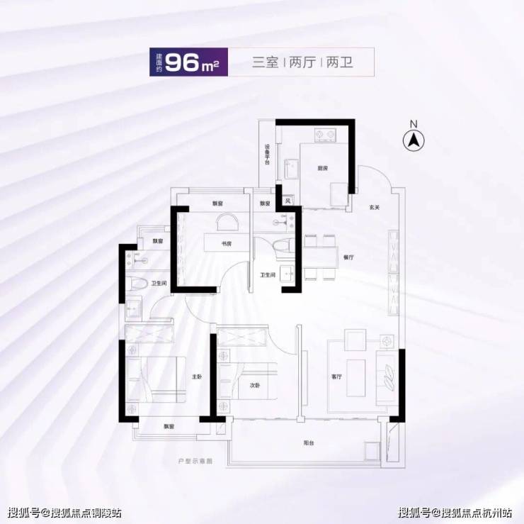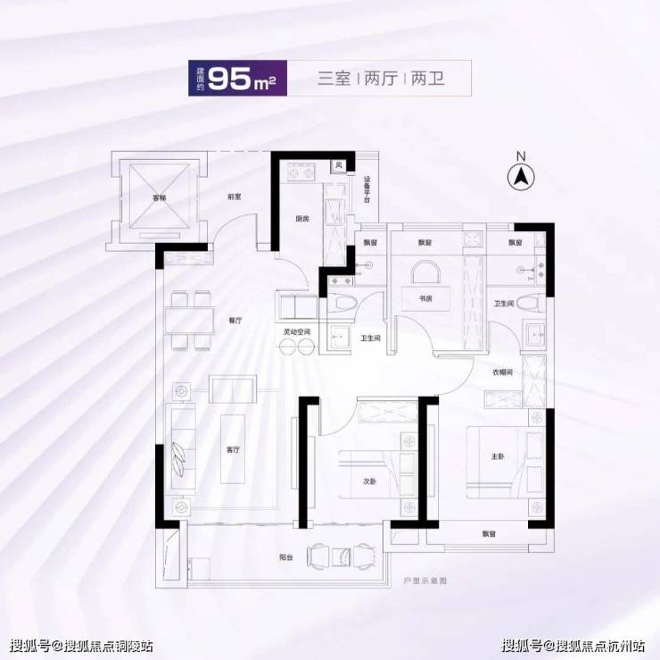 建面约95、96㎡室内拥有双开间大尺度阳台、全屋四处飘窗、套房式主卧,舒适度颇高。