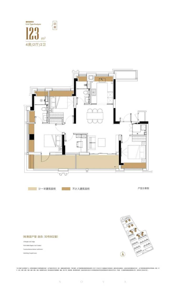 项目建面约123㎡户型则是区域内仅有同面积段宽厅4开间朝南4房南北通透户型,附赠面积高达约17.6㎡,无论是在使用功能上和尺度上,都远超同面积段其他户型。