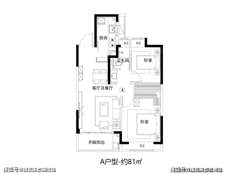 建面约81㎡2房功能齐全,拥有朝南大面宽和全卧飘窗设计。
