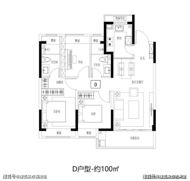 建面约100㎡3房2卫,阳光三房,同等面积更多功能;宽幅南向观景阳台,把居住变成风景;步入式衣帽间,给予生活更多从容。