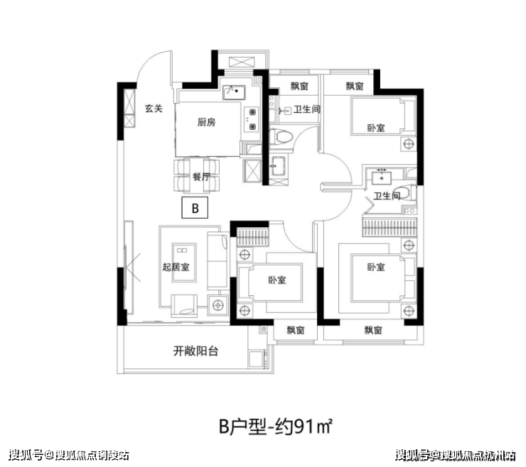 建面约91㎡3房2卫,三开间朝南,客餐厅连通大阳台,四飘窗设计,好户型该有的素质它都有。