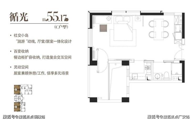 建面约55.17㎡一室一厅一厨一卫:户型布局紧凑合理,功能分区明确。客厅与卧室相连,形成一个开放式的空间,增加了室内的通透感和空间感。厨房采用开放式设计,操作台面宽敞,烹饪设备齐全。卫生间干湿分离,提高了使用的便利性和卫生程度。部分户型还设有阳台,增加了室内的采光和视野。