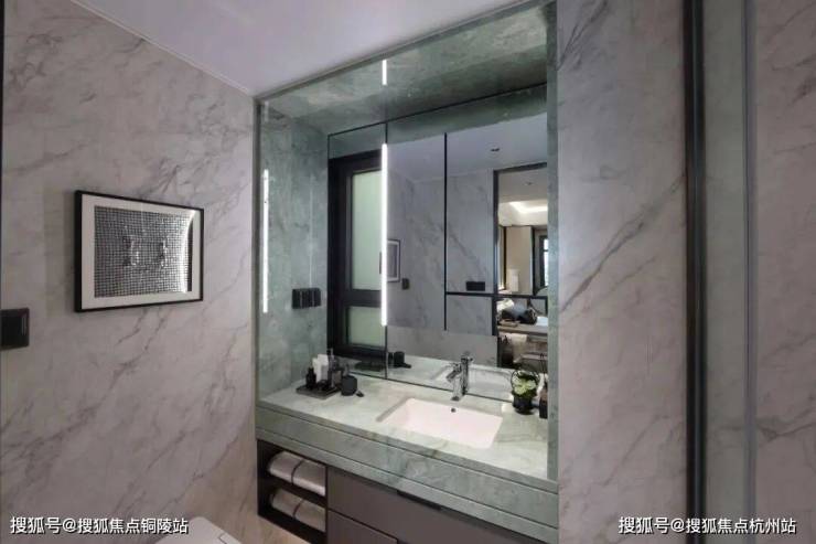 此外,客厅地面选用温德姆灰大理石瓷砖,简一大尺寸瓷砖拼缝仅0.35mm,背景板为云起姑苏岩板,玄关及餐厅墙面铺设美高梅同款金属烤漆面板,主卧入户隐形门设计,客厅一体式背景墙,橱柜收口弧形木饰面处理,餐边柜选用鱼肚灰天然石材铺设,客卫地面铺设云映星辰仿大理石瓷砖,主卫洗漱区台面配置源自意大利的只此青绿奢石。
