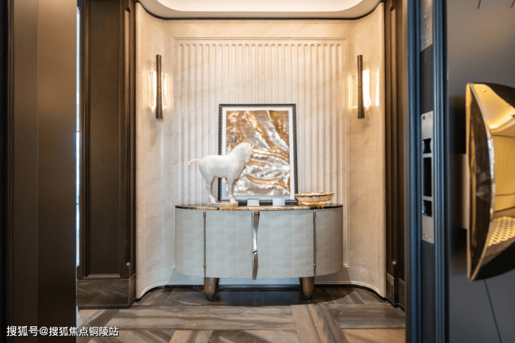 例如入户玄关铺设有“石材皇后”鱼肚印象,这种级别的奢石在很多顶豪项目中通常仅作局部镶嵌