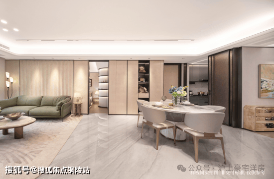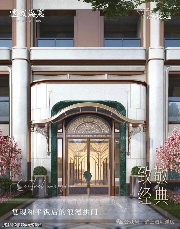 萃取东方色谱精粹,建发·海宸甄选丝箔流金、东方雅铜,青釉奢蓝,以当代笔触晕染立面,令传统色彩在空间生长为永恒的诗意, 「入户门头」形取和平饭店经典拱门,配以碧绿色天然石材门套、彩玻花窗,重现百年外滩门廊的尊崇仪式。