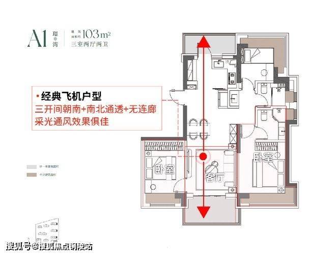 建面103㎡3房2厅2卫,户型三开间朝南、室内“5个飘窗+2阳台”,不管是采光、视野、通风、私密性,还是实用性都十分出色。