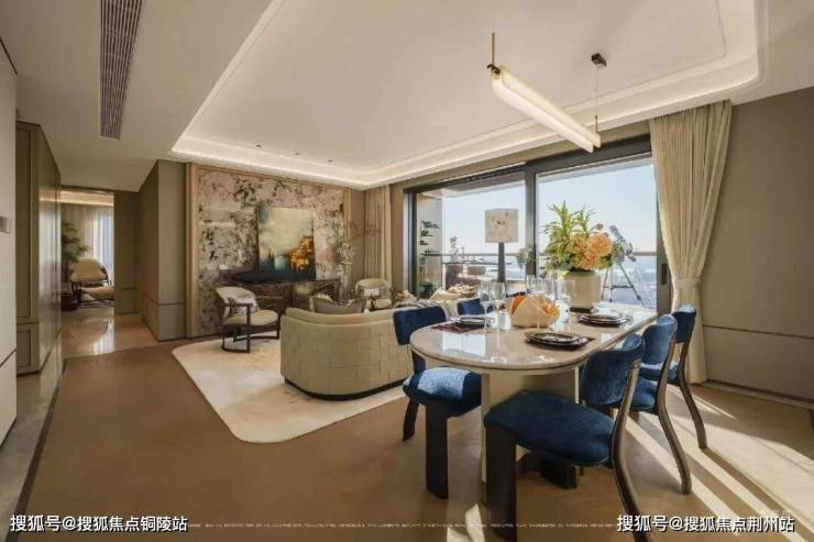 正三面宽朝南格局,搭配观景阳台与全明飘窗,既最大化延伸实用空间,更拓宽观景视野;客餐厅一体化连贯布局,餐桌周边形成流畅洄游动线,告别冗余走道设计,每一寸空间都物尽其用;