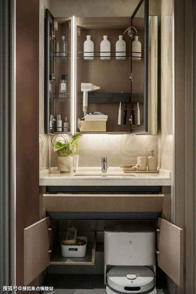卫生间镜柜与预留洗地机位的台下柜,方便清洁用品的收纳,创造独立的家政清洁收纳空间。内嵌LED灯带的防雾镜柜,方便沐浴后的护理与美肤。