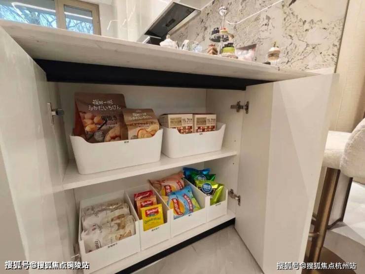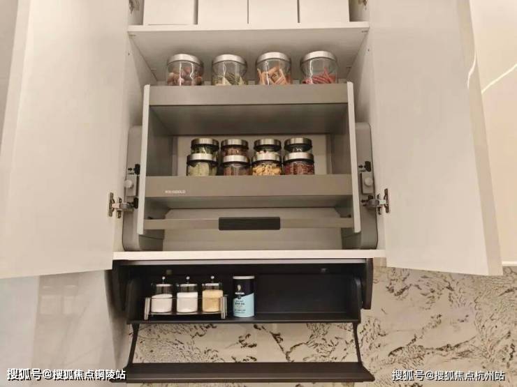 食品库藏在厨房中,上到吊柜里的天使拉篮,下到岛台内部“隐藏式”小推车和拉篮,还有岛台外侧的收纳空间,餐边柜的收纳空间,全都是交付标准!