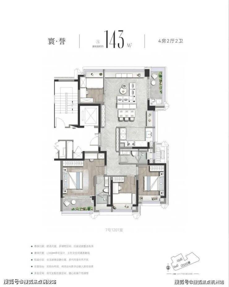 143㎡四房:准一梯一户设计,约 14.2 米南向面宽,LDKB 一体化空间面宽约 4.9 米,主卧套房(20㎡+)配独立卫浴与衣帽间,空间尺度媲美 160㎡+,适配多代同堂。