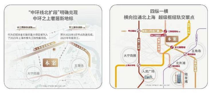 地铁18号线二期(在建)将原本不完全相连相交的四线地铁1号线、3号线、18号线、19号线(在建)横向拉通,北上海轨交因此互联,淞南将成为区域轨交的聚点;同时,本案近邻长江西路地铁站(直线距离约150米),1站江杨南路、5站复旦大学、7站五角场,便捷畅达。
