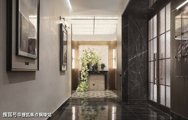 项目打造全石材双归家大堂,入户大堂地面大面积香格里拉黑大理石,墙面配奥特曼米黄石材、莫奈花园大理石,电梯轿厢部分墙面还用上了冷翡翠,会所地面泫雅棕大理石、威尼斯棕大理石局部背景面。