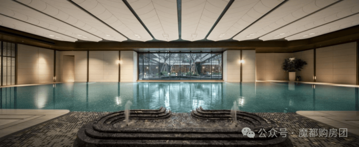 恒温泳池:第一,采用了景德镇烧制的陶瓷马赛克,独特的釉面色彩由景德镇老师傅手工浇筑而成,充满人文艺术底蕴;第二,羽毛天花造型,由600余件铝板打造,表面采用了仿贝壳纹的艺术漆处理,带来松弛度假感;第三,不仅配置了约25m×10m的4道泳池,还采用了奥运会同款空调除湿系统,彰显高档品质细节!