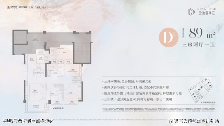 89㎡三房:三开间朝南、全卧飘窗、LDKB 一体化、三分离卫浴,得房率约 78%,刚需一步到位