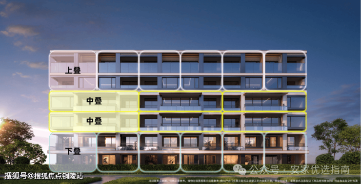 而中叠(建面约123㎡)则集便利与尺度于一身:不仅配备独立电梯厅,更以约13.4米南向面宽、约6米宽厅及南北双270°转角飘窗,营造出宽幕视野与通透空间,体感媲美整层大平层,实得率几近“满格”。