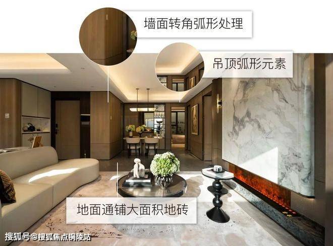 地面通铺的大面积地砖,在弧线元素呼应下,延伸出很强的开阔感。