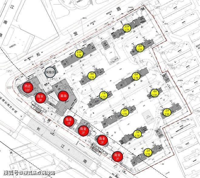 根据设计方案显示,项目拟建11栋12-18层可售住宅,总户数876户,可售住宅约807套;另需建设1栋保障性住宅房,靠近长江南路一侧规划有酒店、商业、菜场、社区食堂等业态。